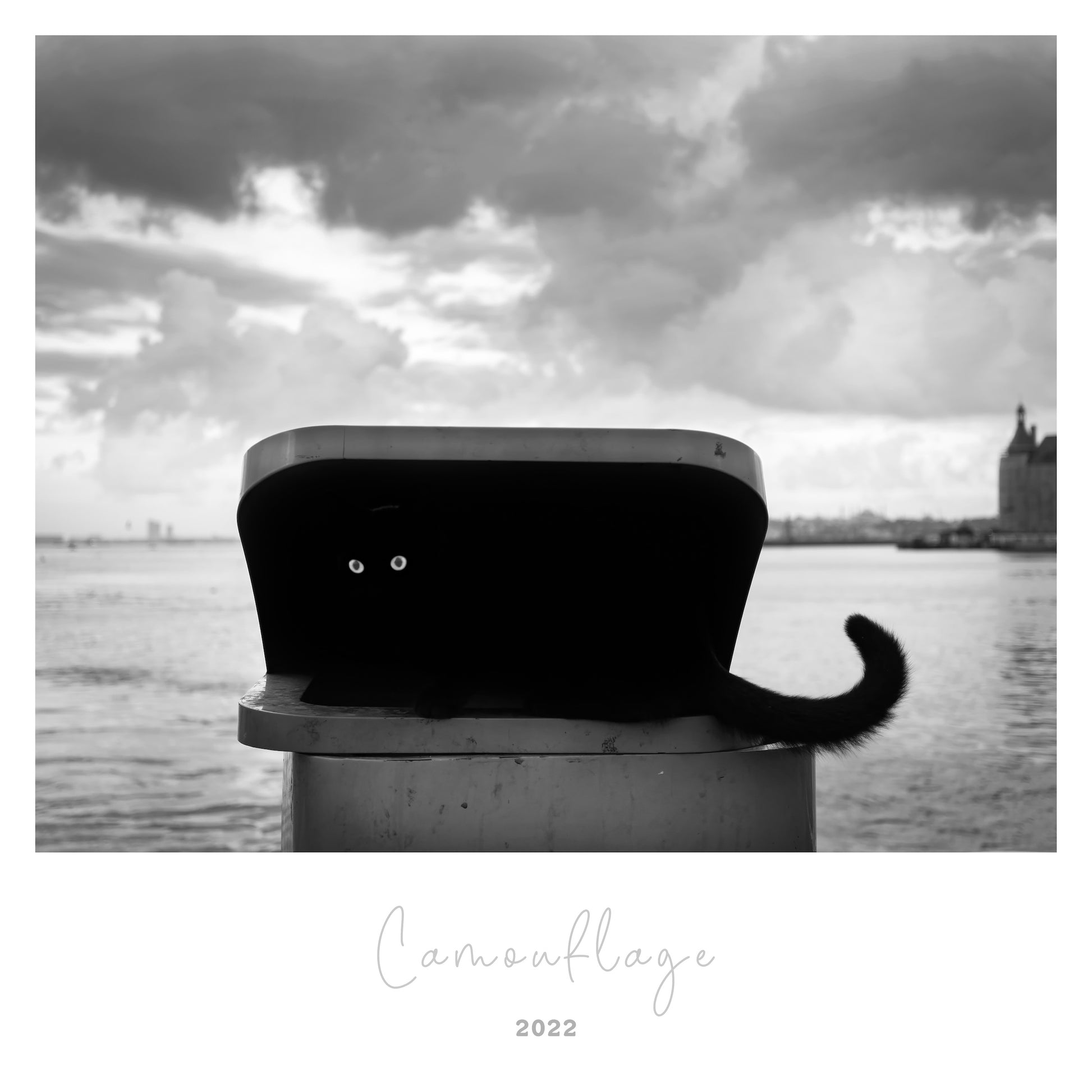 A black cat was playing around a trash can near the water.